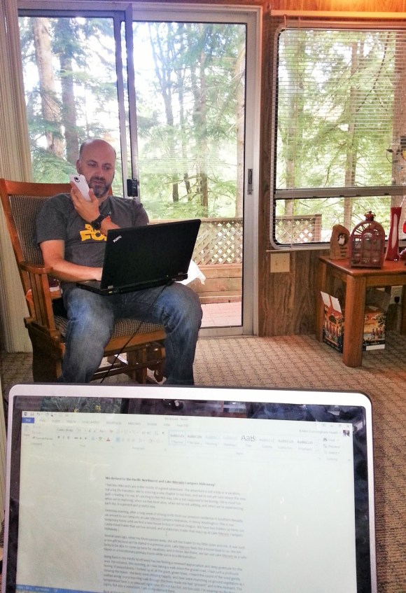 KCCOMPUTER – Mike doing his work and me working on my blog from the trailer