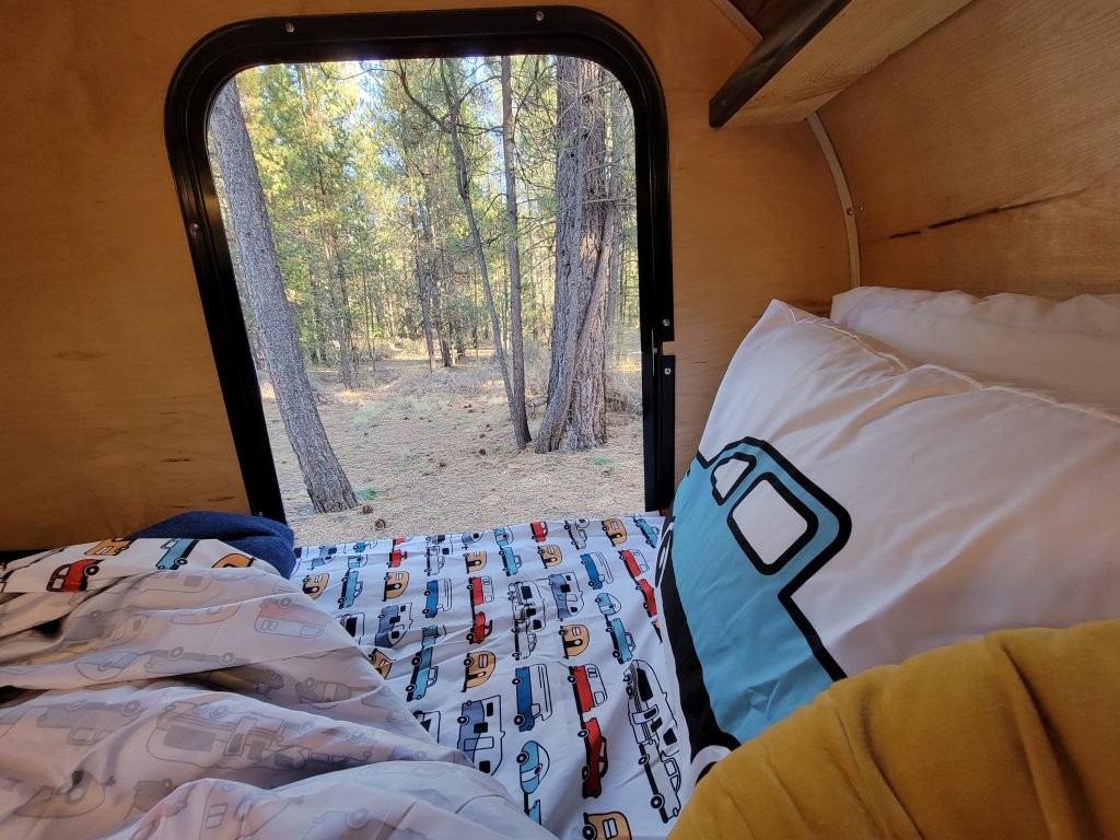 We can use this trailer in many ways. It’s got most of what we need to get out and camp and explore comfortably. We have shore power if we want it, a sink, a comfortable warm bed, lighting, shelving, doors that lock, screens for fresh air, a fantastic fan, and storage. The trailer has just enough of what we need to function well.